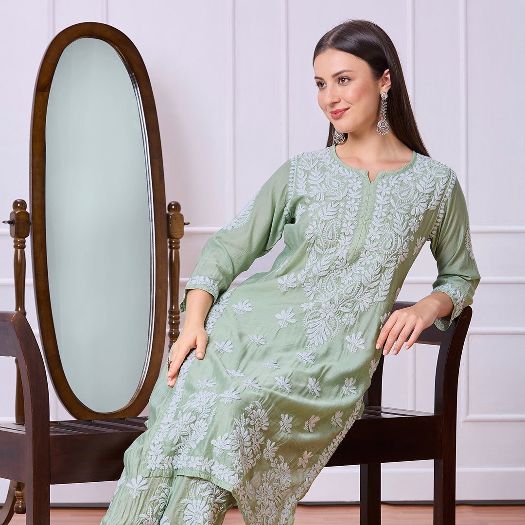 Lucknow Chikankari Hand Embroidered Kurta and Palazzo Set Chanderi Silk