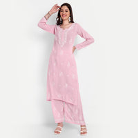 Designed to flaunt the very best of Indian aesthetics, this chikankari embroidered kurti palazzo set is fabricated in rayon and is a must-have to flaunt the new era look. Adorn it in your meetings or evening meet-ups, you are sure to make heads turn. Available in varied colours, make a signature look!
