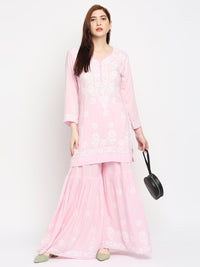 Add some shimmer and style to your look as you adorn this chikankari embroidered short kurti with sharara / garara handcrafted in modal cotton. Featuring embroidered pattern and varied colours, this comfy breathable set is perfect for the free-spirited woman of today. Team it with stilettoes or wedges and slay the day